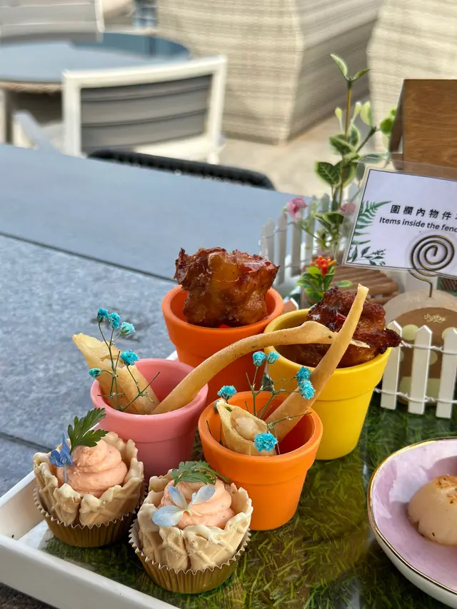 泰式檳寧香烤雞鎚、魷魚蝦枝條、脆旋風薯棒、煙三文魚慕絲脆撻、煙燻帶子伴車厘茄