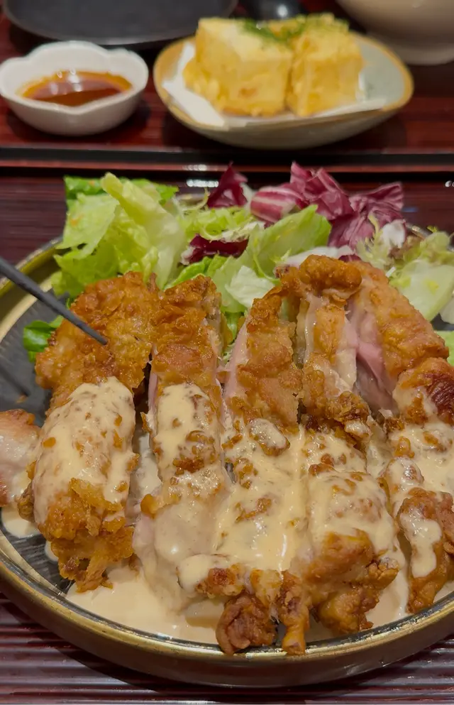 份量真係超!大!一上枱已經懷疑到底食唔食得哂🤣舊舊肉都又大又厚,絕對係雞肉愛好者嘅夢幻之選!雞肉外皮炸至金黃酥脆,入面可以keep住滑嫩多汁嘅口感,食落唔會有雪味同埋唔會鞋,再搭配埋鹹香惹味嘅明太子沙律醬,同雞扒簡直係絕配😋除左雞扒之外仲有配埋茶碗蒸,飯同麵豉湯,男仔食都夠哂飽肚🙂‍↕️