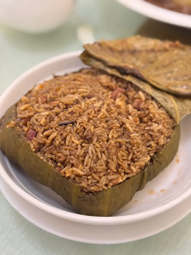 在主食方面我們選了鮮蝦瑤柱荷葉飯,荷葉飯份量十足,鮮蝦和瑤柱佔比很多,每一口都有滿滿的料,荷葉飯雖然深色但不會偏鹹,荷葉淡淡香味和飯香混和了,令人忍不住一口接一口
