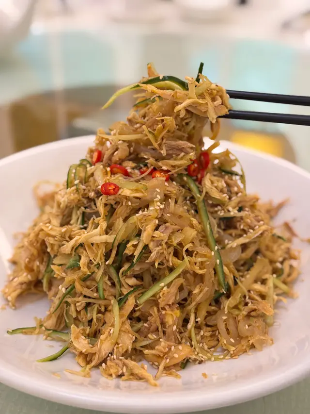 涼盤的青芥冰燒雞,相當開胃的一道涼菜,調味上用了芥末和薑汁等較刺激醒神的味道,雞絲都是廚師精心手拆,肉有香帶點汁,墊底的是炸芋絲和青瓜絲等,口感很多層次
