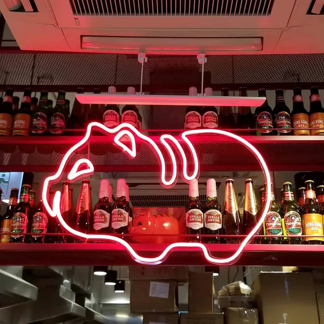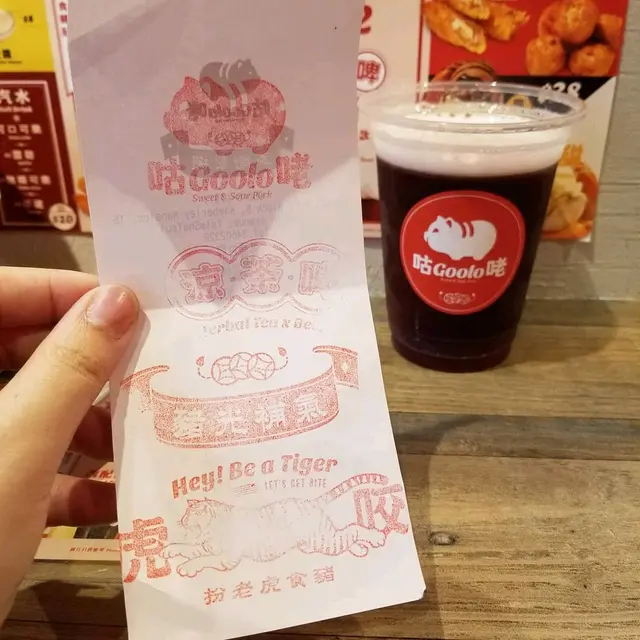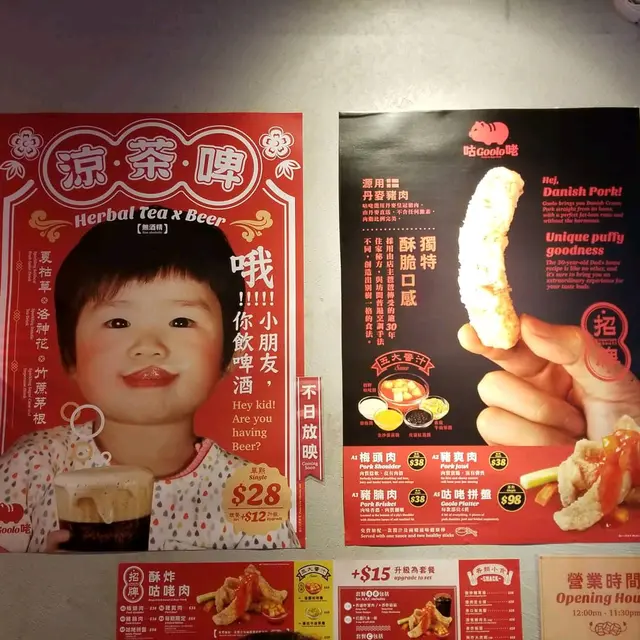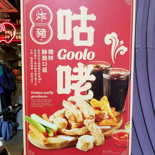 不知是否天氣冷的關係,加上甜品當正餐,我和姨姨很快肚餓起來,又要去覓食止餓。我們發現了一間很有趣的小食店叫咕咾,主要是「賣豬仔」,為何我會說咕咾「賣豬仔」? 因為這裡主打酥炸咕咾肉,咕咾肉來自丹麥小豬的各部位,而店內紅色的霓虹燈小豬標誌可愛極了。