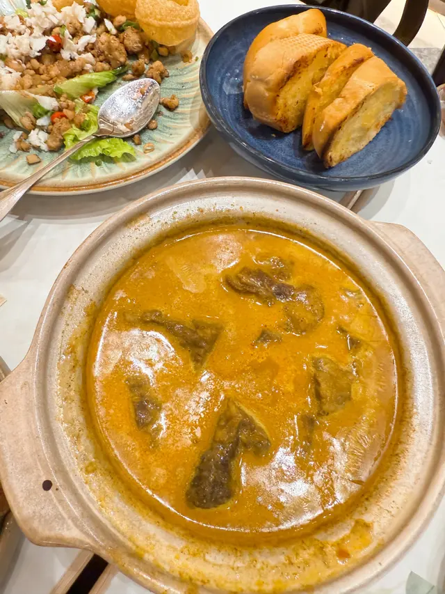 咖喱牛腩煲配蒜蓉法包:咖喱味夠,牛腩亦都好腍,識食梗係要用法包點咖喱食啦,好味😍