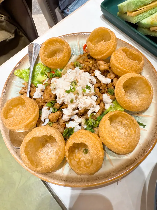 香葉蟹肉辣肉脆脆球:呢個見到餐牌嘅時候就覺得好特別,於是就點嚟試吓,咁樣用個脆球夾住啲肉嚟食,都幾好食,口感都幾豐富