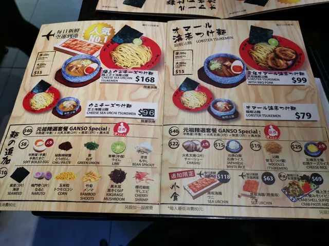 裡面的菜單選擇種類不是很多,主打沾麵為主,配有小量小食。而且這裡最值得吃就是海膽,龍蝦,蟹膏等貴價食材。蟹膏沾麵還可以選擇不同湯底。