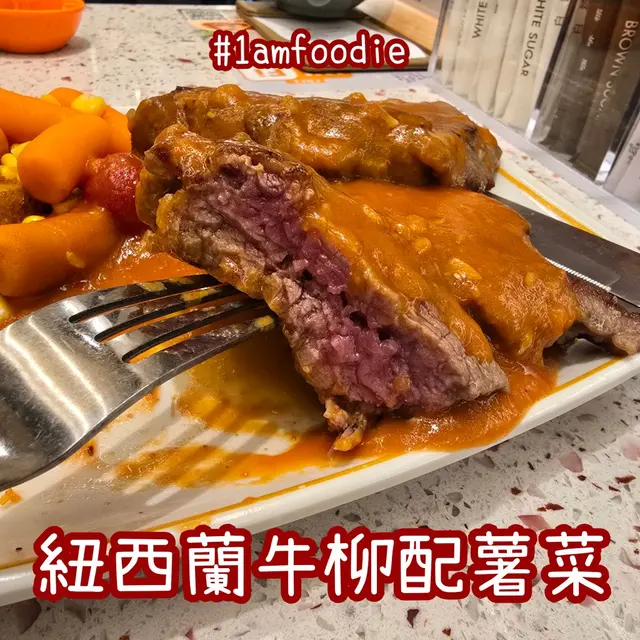 我揀咗 $95 嘅「紐西蘭牛柳配薯菜」,汁就揀咗蒜蓉汁。嗰啲扒就分咗兩塊,望落份量都幾多,都有誠意嘅。不過啲肉質就唔知咩事,好似被人打咗廿拳咁,鬆到好輕易就可以咬開,完全唔似牛肉嘅質感。呢點就令件事觀感差咗,其實其他嘢都做得唔錯㗎。