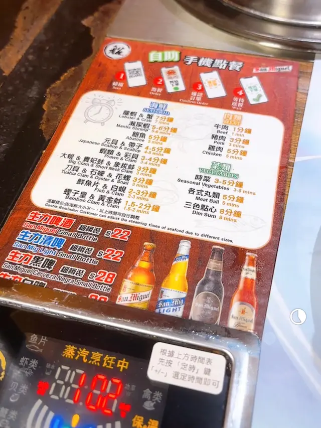 枱上有清楚列出唔同海鮮要蒸既時間,蒸爐亦有計時功能。蒸完既海鮮蒸華會流到下面既鍋底,最後再倒入蟹粥/米線吸收曬所有海鮮精華。