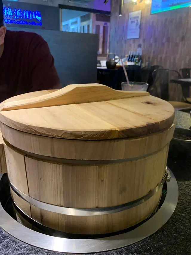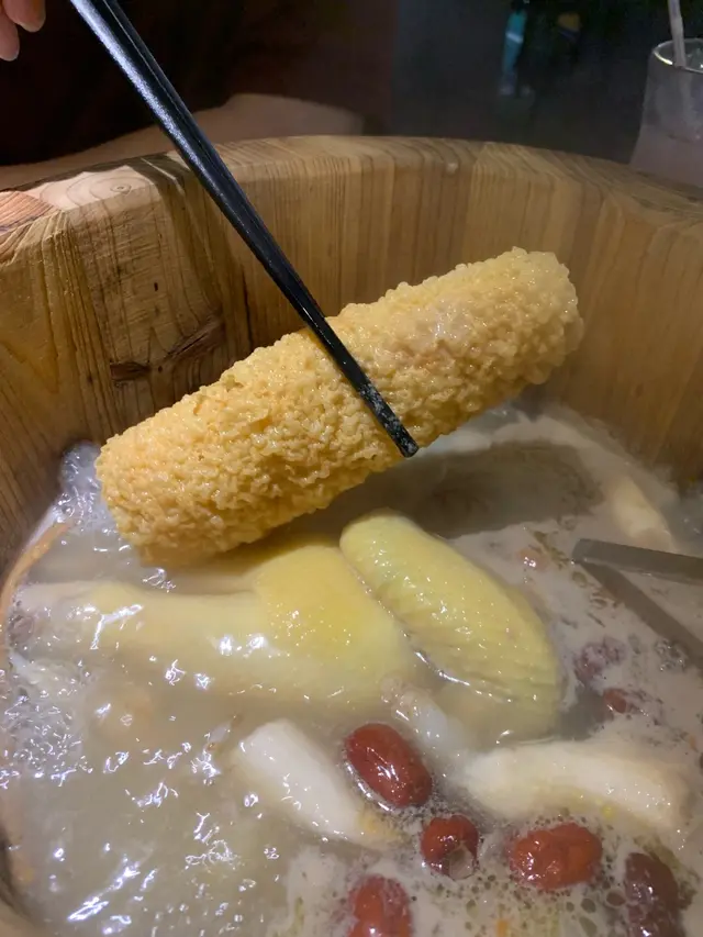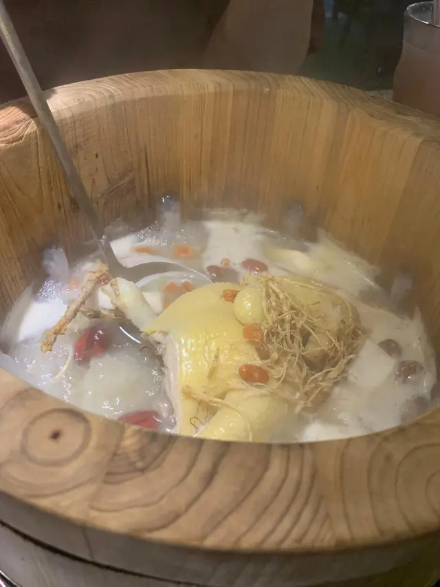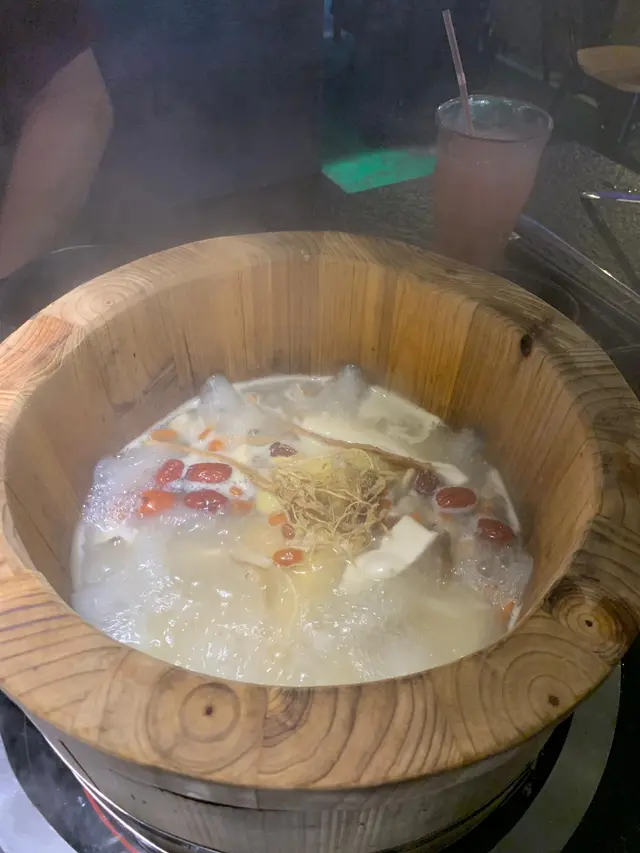 選完湯底, 侍應好快就遞上一個巨型大木桶,一望到真係哇咗一聲。見到我哋個樣都咁新奇,侍應都好主動解釋係點運作。原來大木桶入邊有石春係底下,靠石春燒熱左嘅熱力整熱啲湯,湯底由周圍泉口噴出嘅目的在於噴出嚟嘅湯底會撇咗啲油,令顧客可以飲到最純粹嘅藥膳雞湯。
