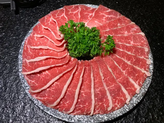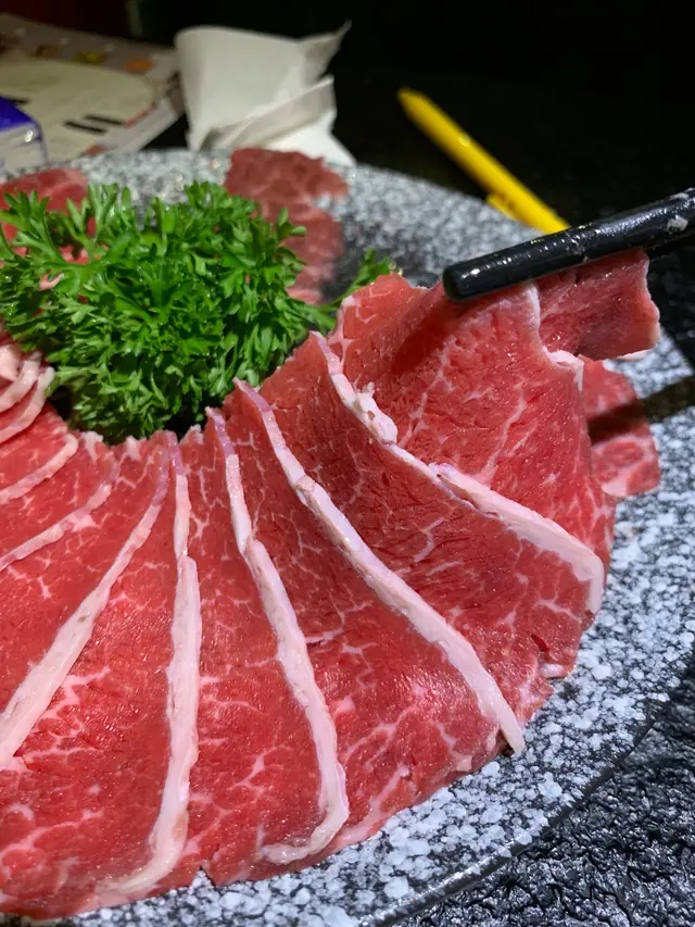 湯底一路煲緊嘅時候, 侍應都順手遞上唔係任食嘅食材過嚟, 貴價肉類有三個選擇, 安格斯牛肩肉,豚肉同埋羊肉, 我哋揀咗安格斯牛肩肉,望到遞上嘅肉, 肯定絕非平價肉, 每塊牛肉嘅雪花其實都好均勻, 色澤夠紅, 絕對新鮮。