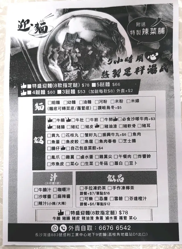 一間用心製作的車仔麵 pcsc等級22025-02-05845 瀏覽 關注 最近荔枝角開了一間車仔麵店,雖然門口貼住試業中,但我已經幫襯左幾次,原因係佢地的湯底(金湯),真係食得出,佢地係用心及時間去淆製湯底,同平常的車仔麵店,係有好大的分別,加上佢最特別,係有"豬油渣",每碗麵都會送少少豬油渣,令每位客人都可以品嚐佢地的特色食物,除了豬油渣,其他食材都炆得好入味,仲有唔好錯過享用菜脯及辣油我聽大廚講,原來佢鑽研車仔麵多年,一直唔贊成車仔麵粗製濫造,所以佢用心研究新食材及口味,目的是想客人食得開心又不沉悶呢間車仔麵店的老闆及職員,都會以禮相待客人,在香港的食店,真係買少見少,佢地令客人有一種親切及賓至如歸的感覺。最後想講的係,如果個麵底可以加多少少,令大食的人都可以夠飽,咁就perfect 啦2114以上食評乃用戶個人意見 , 並不代表OpenRice之觀點。1分享一間用心製作的車仔麵 迎麵 https://s.openrice.com/QrbT0aWPQ00檢舉 張貼 評分5味道5環境5服務5衛生4抵食用餐日期2025-01-25等候時間5 分鐘 (外賣自取)人均消費$60