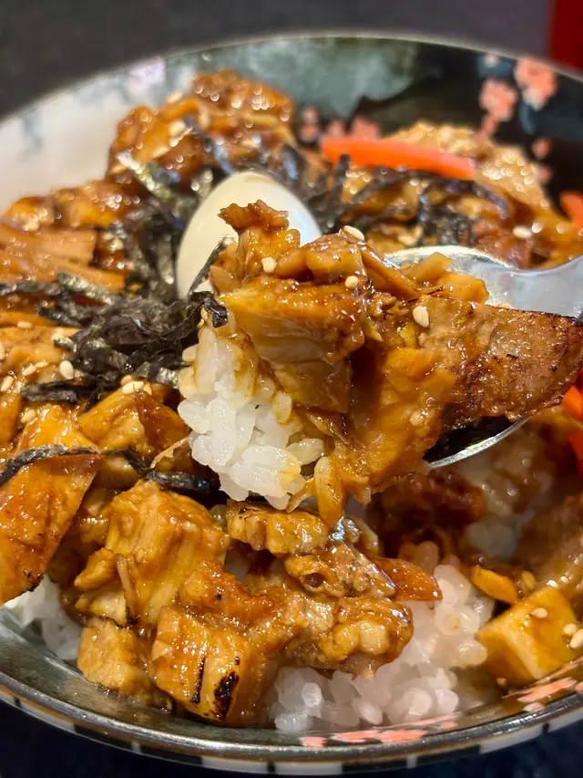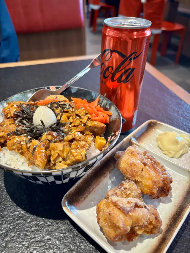 豚肉丼出乎意料地大碗,肉粒鋪滿飯面,鹹甜有汁,炸雞外脆內嫩,咬開仲有肉汁,好滿足。