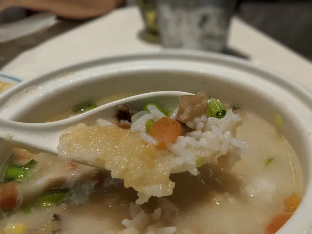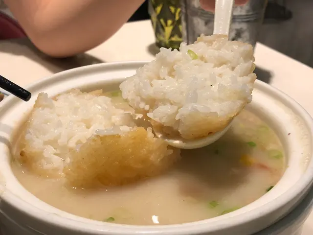 吃金黃球泡飯,首先要將金黃球拆散,把飯泡浸過上湯後更美味,吃到脆脆的外皮,但又未有一般飯焦般硬,恰到好處,內裡則是軟的,口感相當過癮。