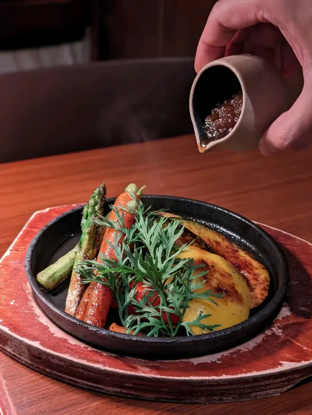 😝😝晚餐當然要吃點蔬菜,這款是當日烤蔬菜,把甘筍、蘆筍、彩椒、南瓜、翠玉瓜等鋪滿鐵板上,加上迷迭香及蒜香瑤柱醬,十分惹味!