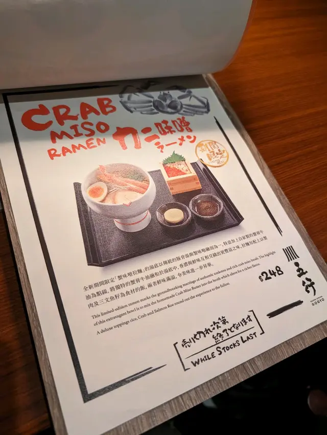🤩店員推介期間限定的蟹味噌拉麵,豚骨湯底加入濃濃秘製蟹味噌,加入長蟹棒和香嫩卷腩叉燒,還有最愛的半熟流心玉子,而拉麵口感比較有彈性👍🏻此外,當中的蟹膏牛油非常出色,可加入拉麵湯中顯出其濃厚鮮味😍,蟹棒可沾上GOGYO特調的蟹醋,淡淡酸味提升了蟹的鮮甜🫶🏻