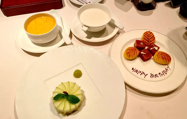 雖然已經好飽,但仍然叫埋甜品,楊枝甘露非常透心涼,芒果香甜。友人點嘅杏仁茶湯圓亦非常香滑暖心。而西式嘅青蘋果幕斯亦做得唔錯,酸甜清新中和飽膩感。最後四季酒店嘅糕點一向都好出名,美點薈萃雖然係奉送,但出品亦完全唔馬虎,入口酥香,為依餐摘星之旅劃上完美句號。