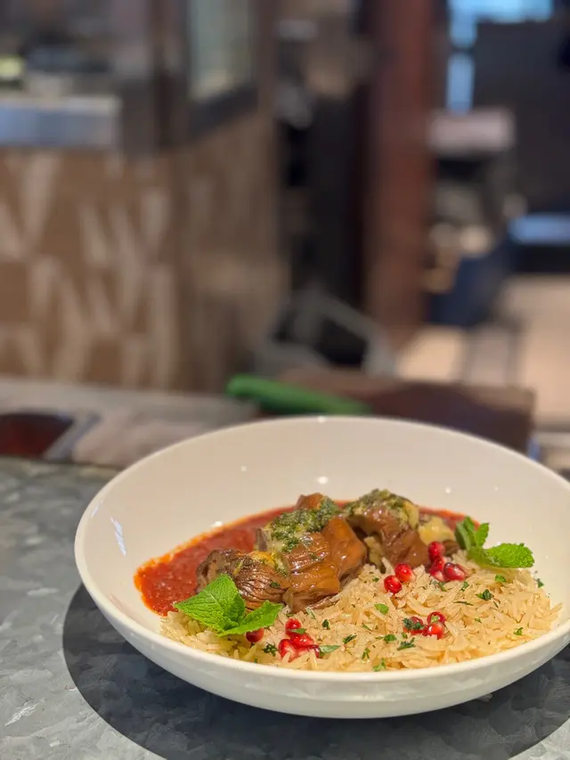 石榴烤茄子配糙米飯🍚茄子配合石榴烘烤,加強茄子甜味,再配合中東蕃茄醬同脆蒜,酸酸甜甜😍好開胃✨