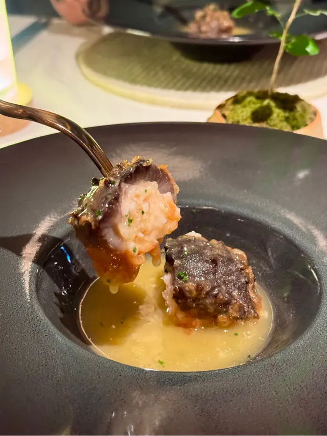 🫕濃雞汁百花脆皮刺參 – 手工菜代表作!刺參裹上蝦膠再炸,外皮酥脆,內裡軟嫩,層次超豐富~