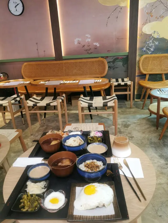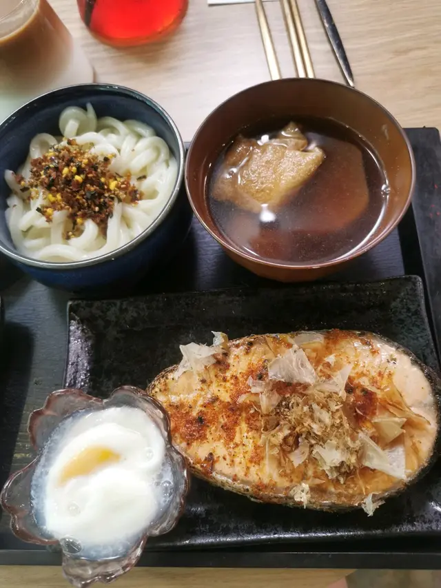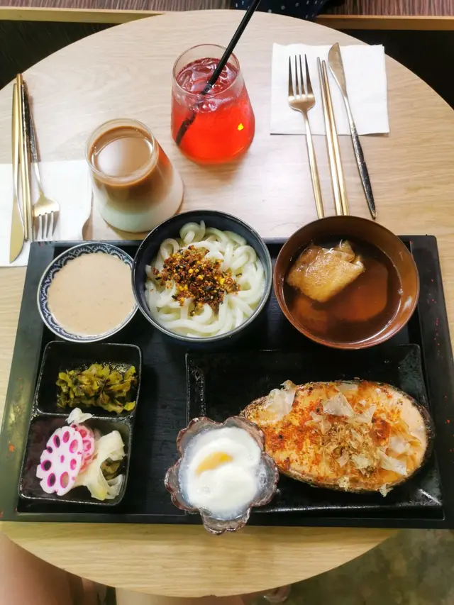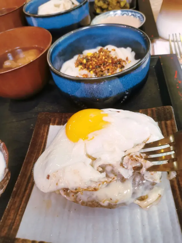 定食有日式漬物,關東煮、溫泉蛋、烏冬。 和牛漢堡面頭仲有隻煎蛋同夾咗芝士🧀,幾香。 烏冬撈埋飯素同麻醬幾好食。