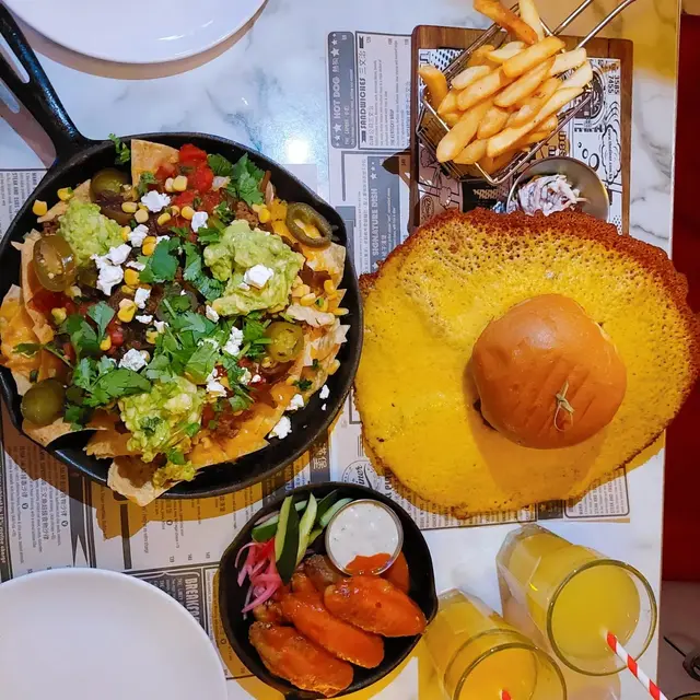 美式菜出名大大份,今次慕名而來為咗食店家嘅signature 裙子漢堡,真係好有特式,一上台就俾佢果塊大過我塊面嘅車打芝士吸引,廚師係open kitchen 即叫即整,所以芝士味真係好香.重點係呢個burger睇得又食得,入面塊安格斯beef patty 大概有半寸厚,煎到5成熟,好juicy, 加埋caramelized onion,真係流哂口水!因為塊芝士面積太大,所以我切唔到,所以我拎出來撕開兩邊, 疊埋再放番落個burger到,大大啖咬落好,woo,好正呀! 仲有跟配薯條同埋Cole slaw 迷你沙律,成個餐絕對夠兩個人食呀!