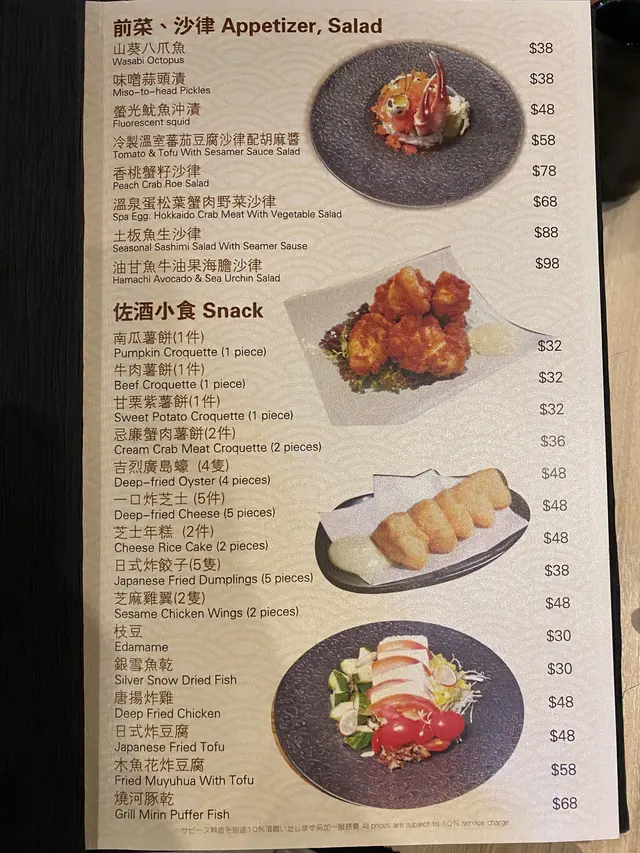 餐牌選擇好多,有前菜,沙律,刺身壽司,主菜,天婦羅等等。