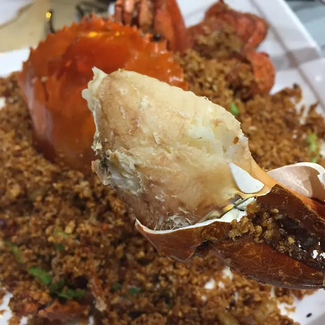 龍蝦通常是蒸焗為主, 避風塘的煮法, 創意亦能保持肉質鮮味, 兩三下就能把殼拿走, 別只看面層, 內裡收藏著多件蟹腳, 如尋寶般找出食物