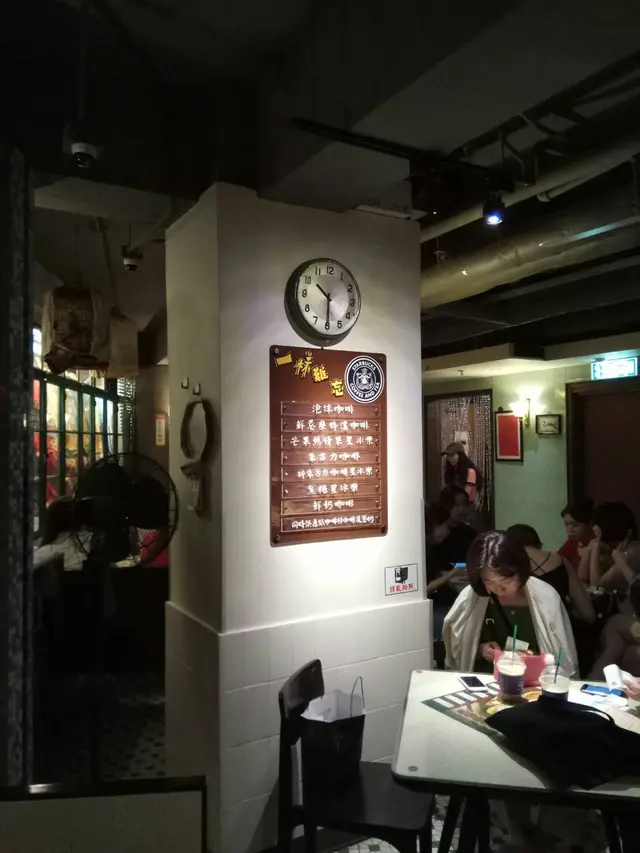 轉頭望去看到這樣暗燈下的情景搭配懷舊餐桌椅和牆上的時鐘