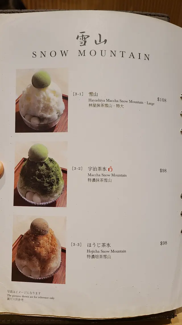咁耐無黎,餐牌好似同之前一樣。甜食有啫喱雪糕,餡蜜,雪山,芭菲,布丁,蕨餅,年糕甜湯,白玉甜湯,芝士蛋糕,法式聖馬克抹茶蛋糕,卷蛋,另外亦有鹹食如蕎麥麵,烏冬,稻庭麵,鰻魚飯,牛肉丼,牛肉烏冬,金目鯛魚定食,鯖魚定食,雞扒飯,其他定食等。茶有日本最好嘅抹茶玉露,焙茶,玄米茶,煎茶,紅茶,黑豆茶,沙冰,牛奶,沙冰雪糕等。雪糕口味主要係抹茶同焙茶。餐牌寫每人最低消費一樣野,用餐時間普通座位為90分鐘。