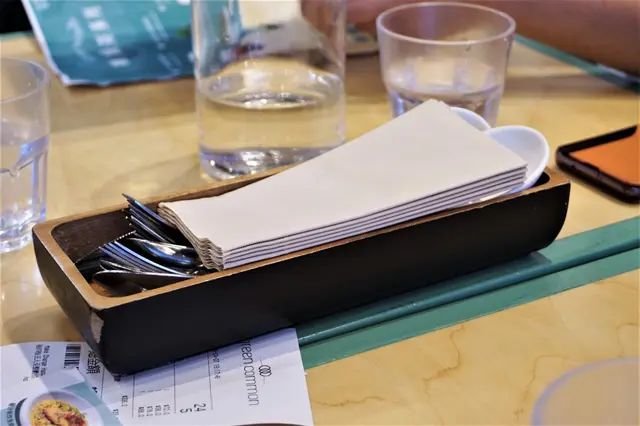 簡單嘅餐具、餐紙放晒晌枱面,自由取用。