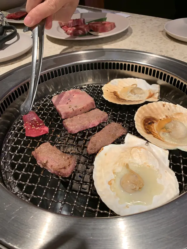 呢度有好多卡位坐得非常舒適,又有圍裙提供唔怕燒肉油彈到件衫,非常貼心。用手機落單之後仲好快喺自助通道上菜,攞完啲肉記住要關返門。店員一開始問我哋要唔要燒肉船,上面嘅肉類其實用手機點單都係一樣,不過有隻船打卡就靚啲,咁我哋都要返隻船嚟睇吓啦。船上都係有啲海蝦、帆立貝、蔬菜、牛肉,睇得又食得。