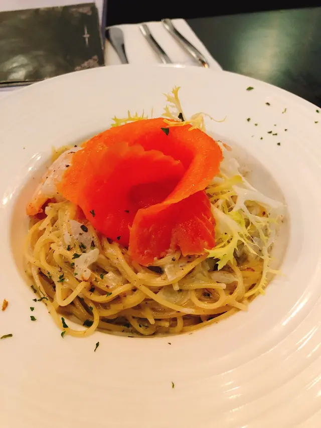 一坐低叫咗個set,煙三文魚海蝦黑松露天使麵,個天使面煮得啱啱好,唔會太硬。個麵採用左鮮甜嘅配料,三文魚魚味香濃,顏色非常之漂亮,加咗啲百里香、可以去除三文魚嘅腥味,果然唔錯!