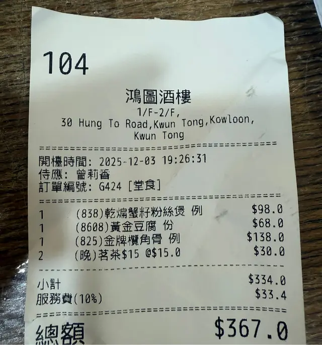 傳統酒樓中嘅表表者 為食甜心等級42025-12-07 關注 傳統酒樓中的表表者 以前係觀塘返工 成日都嚟呢間酒樓食飯 呢間酒樓絕對係屹立觀塘數十年👍值得支持💪🏼 外面復古裝修 非常氣派👍好啱打卡🥰入面地方乾淨闊落 坐得舒服 職員殷勤有禮👍 ✨乾煸蟹籽粉絲煲$98有蟹籽 紅蘿蔔絲 椰菜絲 冬菇絲 蝦米 炒到好香 煲仔上 可以keep住個溫度 好有鑊氣😋 ✨黃金豆腐$68外邊炸到酥脆 裏便仲好嫩滑 非常好食嘅小食😋 ✨金牌欖角骨$138好入味 欖角味好出 排骨部位揀得好好 有骨之余又啖啖肉😌🤣 鴻圖樓 (觀塘)觀塘鴻圖道30號1-2樓 以上食記乃用戶個人意見,並不代表OpenRice之觀點。讚好分享傳統酒樓中嘅表表者 鴻圖樓 https://s.openrice.com/QrbT0Ku5V00檢舉 張貼 評分5味道5環境5服務5衛生5CP值用餐方式堂食