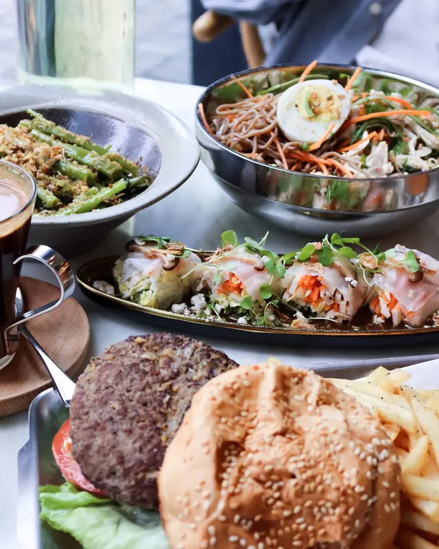 我地去到仲係lunch time,而主菜實在太吸引喇!因為揀唔落手所以最終店員推介左呢個雙層漢堡俾我地試!兩塊patties厚度啱啱好,煎得好juicy,一拎起就開始漏汁🤤 配以蕃茄同生菜,而印尼嘅巴東汁好特別,配搭burger唔漏之餘仲好惹味!