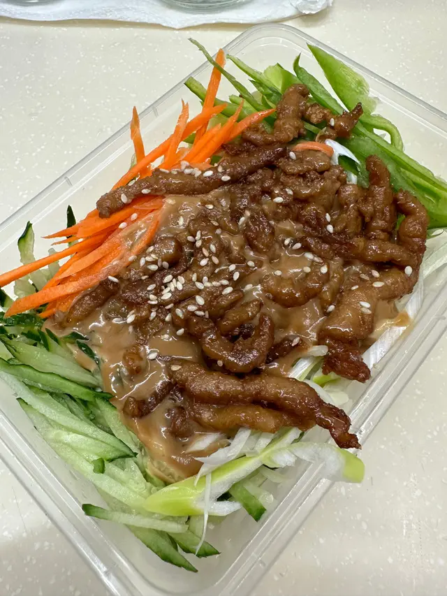 買埋外賣🥡返去比老公食,用多料!好多肉絲,青瓜絲,蘿蔔絲,下底係冷麵,不過唔建議外賣,因為時間耐左索左d麻醬,個麵會有啲杰,但味道好食!現場食發揮更好!