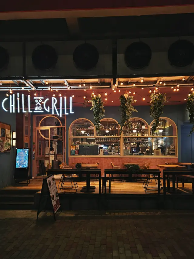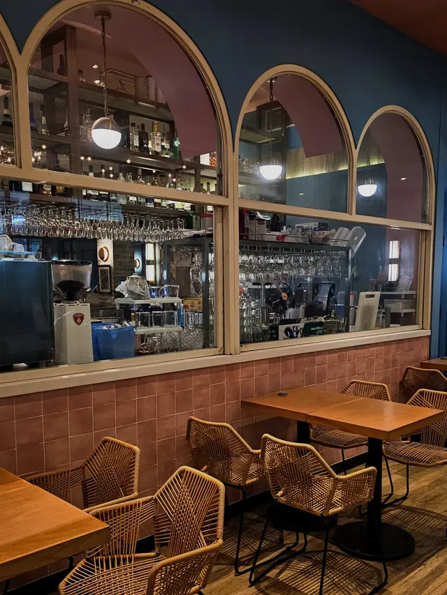 餐廳以藍色搭配淺木色的裝潢風格,搭配水晶燈及拱形窗。