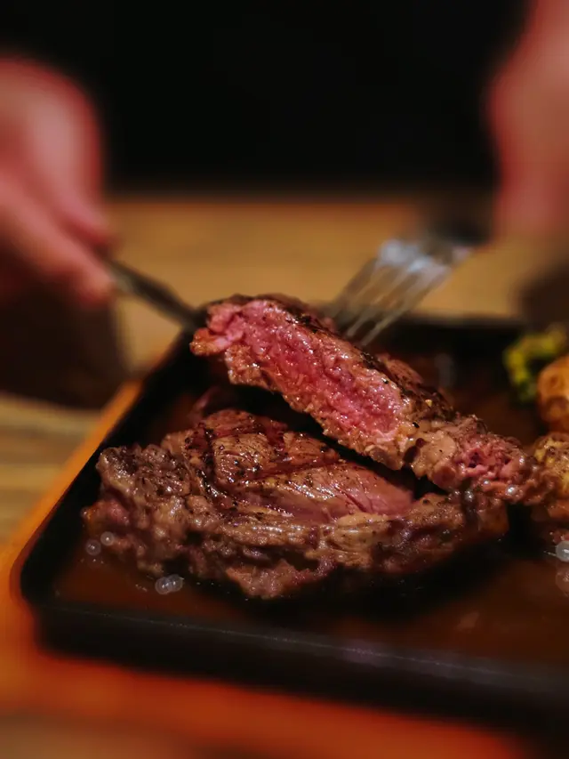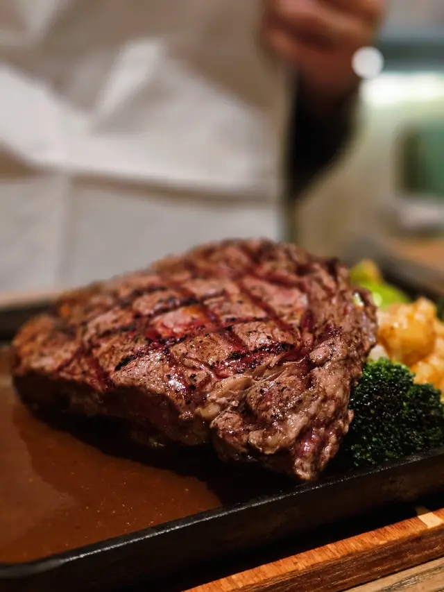 點了五成熟,肉眼上菜時會用一塊大鐵板盛著,滋滋聲配上烤肉的香氣實在非常誘人;