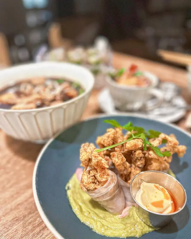 大大件蟹件以煙韌米紙包住,沾上牛油果醬酸酸地幾開胃,仲可沾埋蛋黃醬