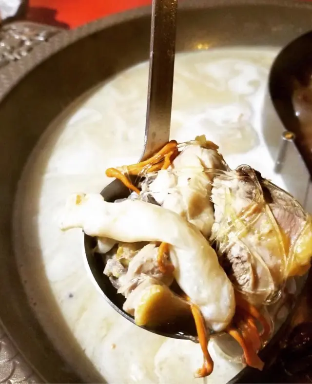 ●驚喜菜式: 黃金蟲草花花膠雞煲翅湯鍋