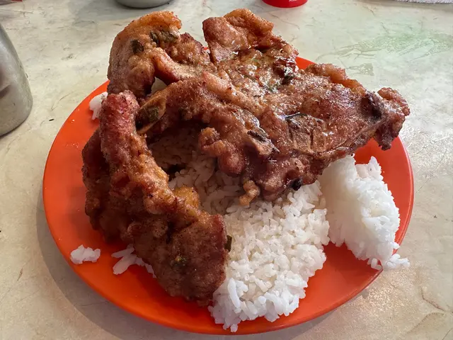 pork-chop is freshly fried. big size, serve with sweeten saurce. crispy outside, tinder inside.