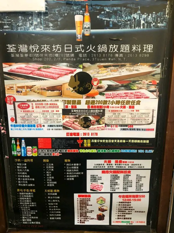 平日2佰幾蚊,有刺身、壽司、天婦羅、一品料理、火鍋、芭菲雪糕、沙律吧、飲品,CP值高,雖然地方交通不是最方便,不過價錢吸引。