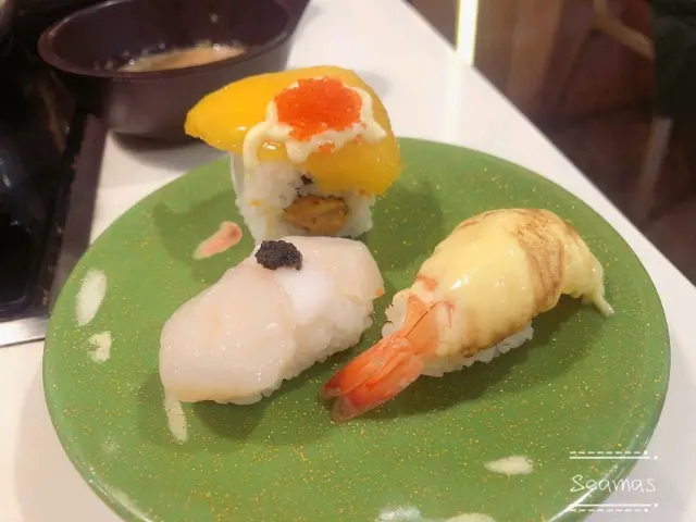 第一回合是「刺身」有:墨魚、帶子、北寄貝、赤貝及有頭甜蝦,北寄貝非常新鮮爽口,帶子和赤貝都很不錯。第二回是壽司,海膽赤蝦、黑松露帶子、火炙芝士蝦、芒果吉列蝦卷,都不錯。