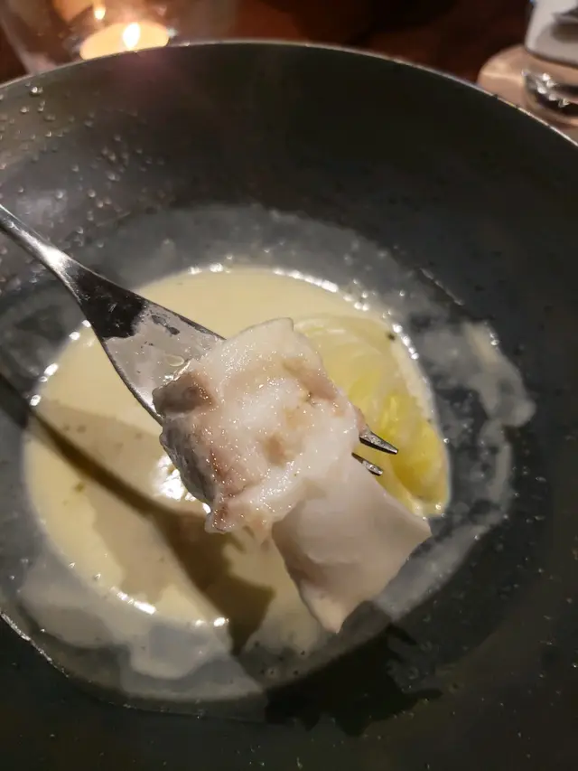 另外一款主食野生鱈魚配椰菜及燻魚籽伴鯷魚溫熱醬,用了椰菜包裹著野生鱈魚,鱈魚肉非常鮮嫩,質感軟滑鮮香,椰菜卷放在一碗鋪上用燻魚籽及鯷魚製作的溫熱醬上,溫度不會太熱,易入口而且夾雜魚肉伴食,有助提升鮮味,口腔中有陣陣的餘韻,真是滋味吃不停。