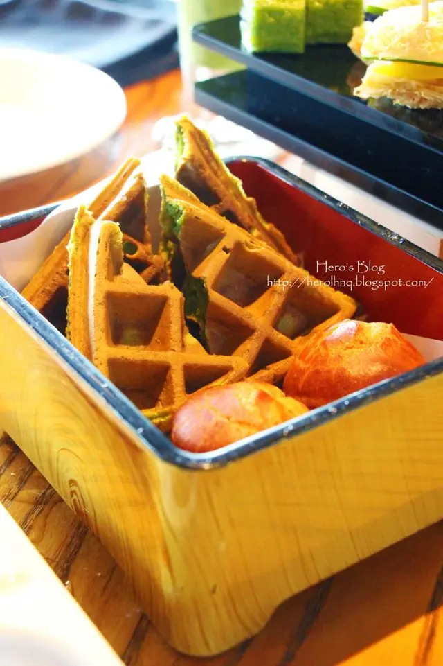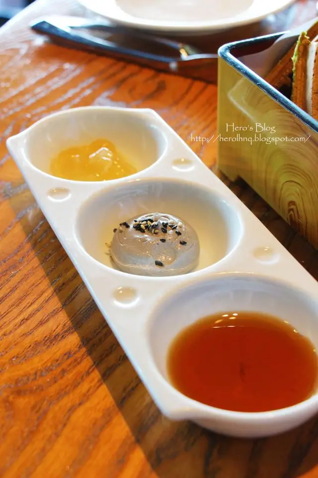 日式下午茶沒有Scones,取而代之的是抹茶窩夫和紅豆泡芙。紅豆泡芙中的紅豆忌廉味道太甜,不大能嚐到紅豆香。抹茶窩夫茶味輕描淡寫,拿上手已是又冷又軟的。伴上三款醬,蘋果果醬味道太甜,跟窩夫不是很搭。芝麻醬幼滑,如芝麻味能更突出一點更佳。柚子蜜糖甜美混入了清幽,是三款中我最喜歡的一款。