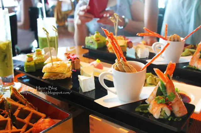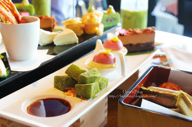 甜點方面,抹茶蕨餅茶味不重,黃豆粉不足,口感也不夠柔軟,不好吃。櫻花蛋糕清香,未算太甜,食味還好。朱古力布朗尼味道太甜,表面的慕絲層也太甜太厚,恰巧跟我早一天在帝苑酒店吃到的那個布朗尼是雲泥之別的對比。