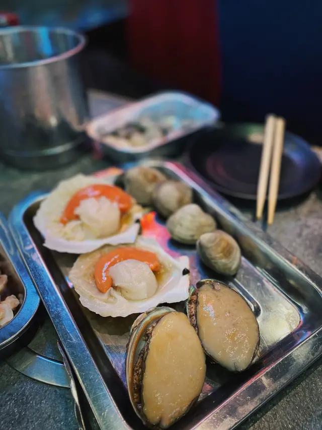 海鮮洗得好乾淨,喺自助區拎完可以即燒,再有蒜蓉醬令海鮮燒得更惹味。鮑魚同扇貝好大隻,肉質都好鮮嫩。另外因為有free flow清酒,加咗啲去兜硯到做清酒煮硯,加埋任拎嘅蒜同蔥花味度超香濃惹味。