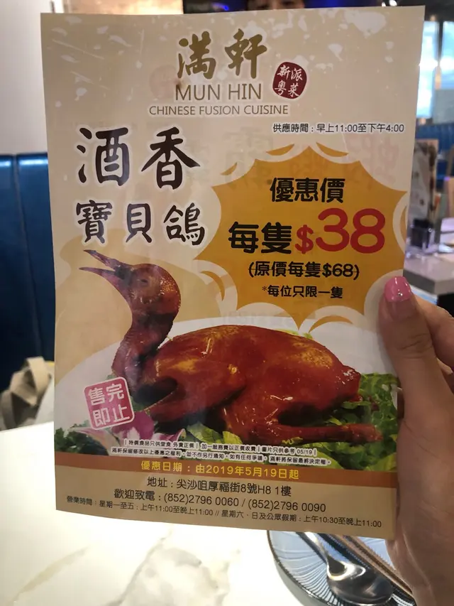 咁就睇吓有咩食先,見到推廣酒香寶貝鴿$38,每位限叫一隻,餐廳仲可以幫忙一開四,所以我哋叫咗一隻試吓,隻寶貝鴿熱辣辣,個板脆卜卜,醃料味道有別於平時食開嘅紅燒乳鴿,因為佢帶咗酒香,所以都幾好味
