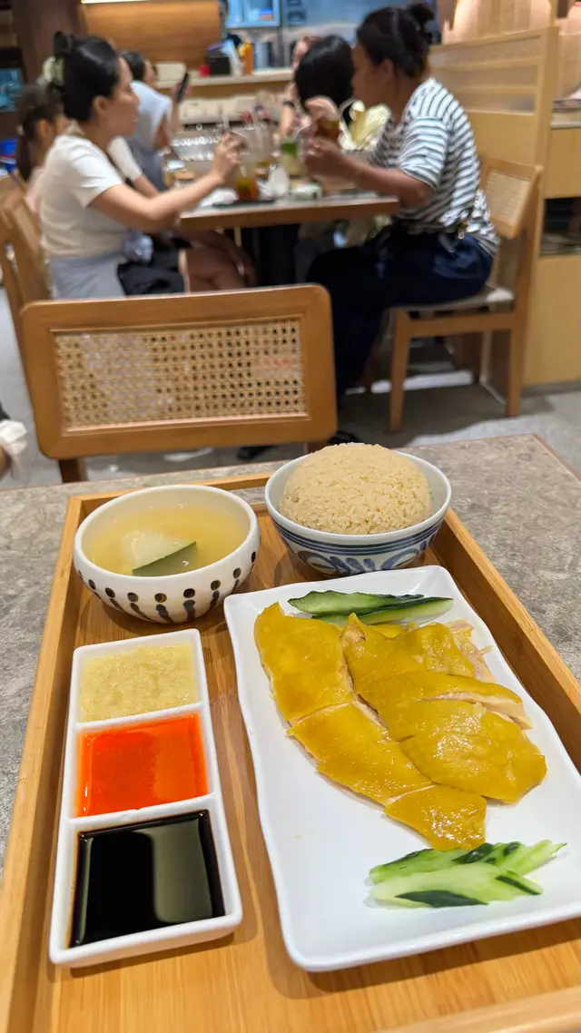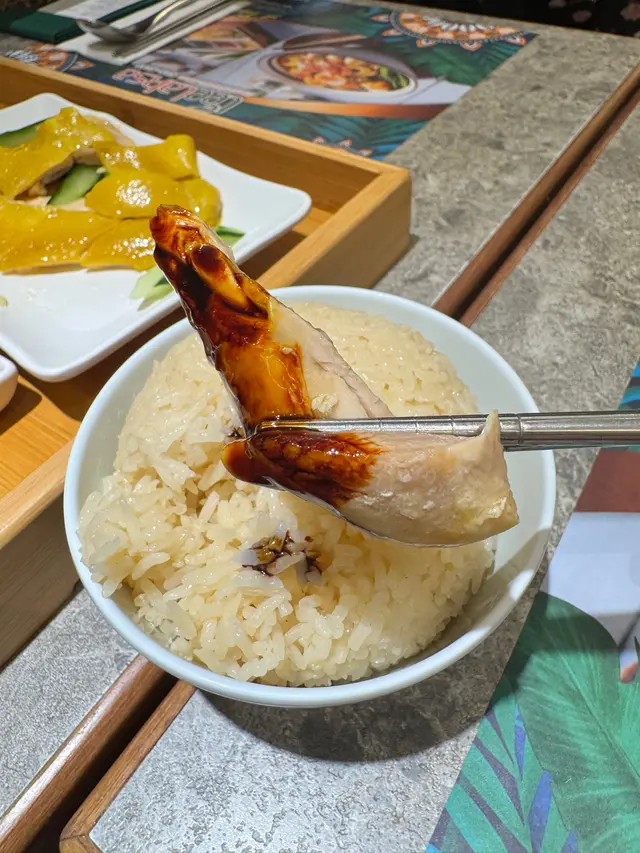 $68「海南雞飯 Hainanese Chicken Rice」:海南雞皮黃肉白幾好雞味😋,又有一碗雞油飯🤣,仲有新加坡黑醬油、辣椒醬、薑蓉可以沾雞食🤣