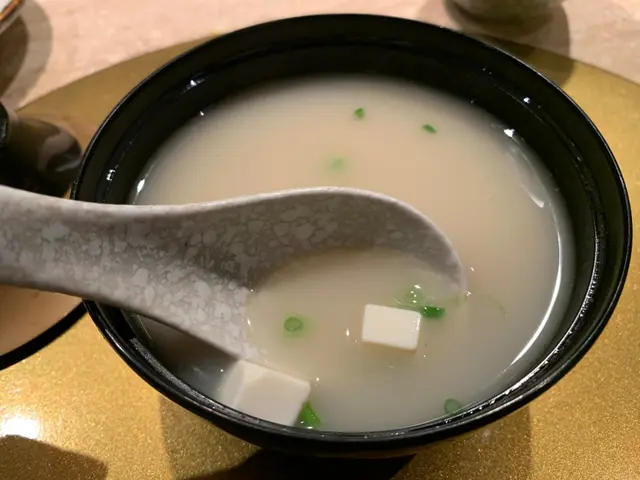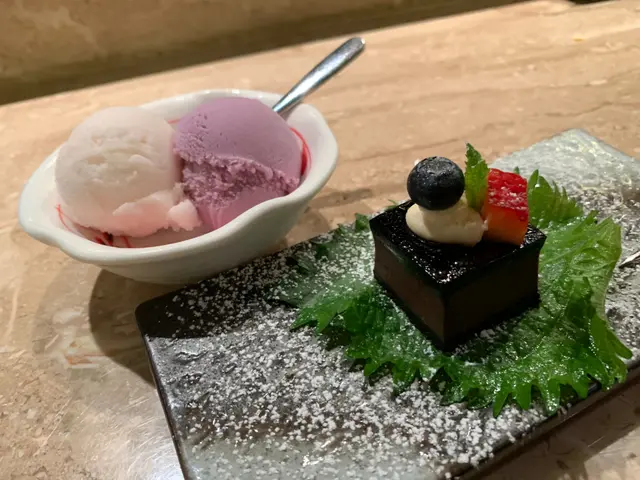 兩件切成方形嘅大拖羅,一件上面放了鹽昆布同黃菊,另一件放了wasabi同岩鹽,先食放了鹽昆布同黃菊的那一件,鹽昆布中和了大拖羅的肥膩,再食放了wasabi同岩鹽的那件,呢件更鮮,原來wasabi同岩鹽係可以提升魚味。