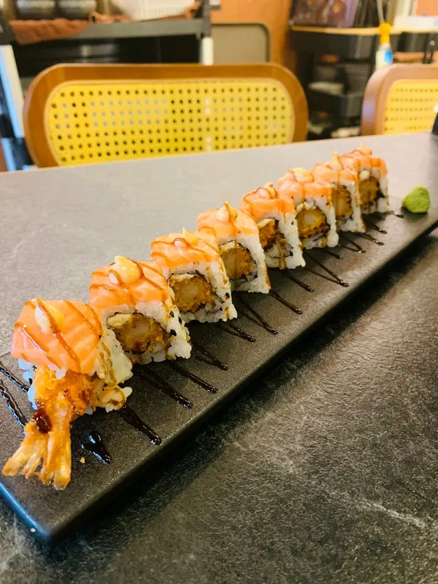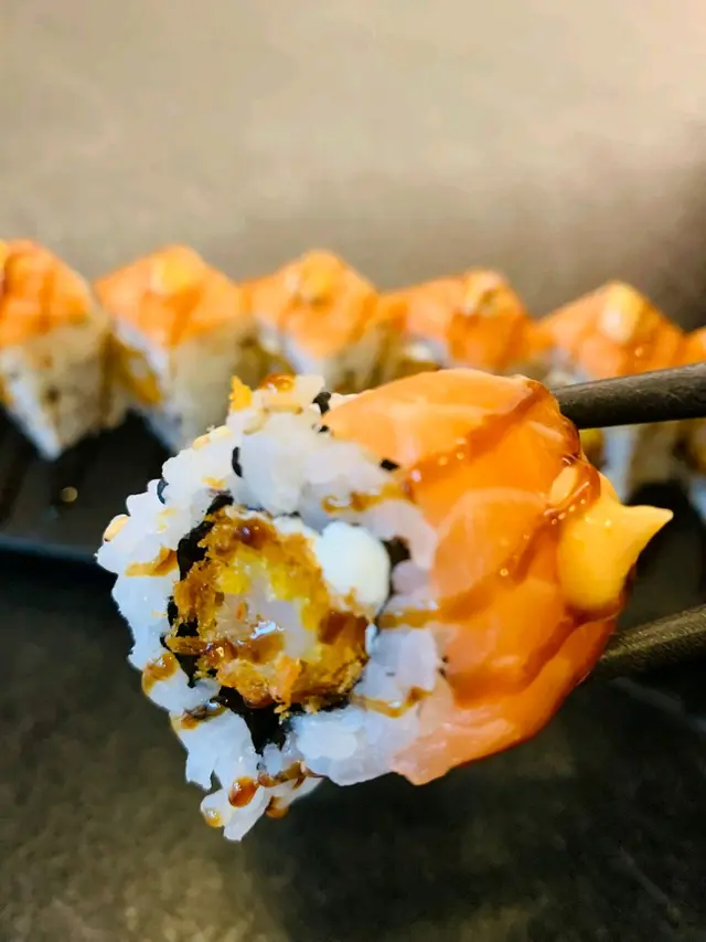 每件都係米飯包裹住炸蝦,上面鋪上三文魚再點上芝士,既有炸蝦嘅香脆鮮甜,又有三文魚嘅油潤口感,加上芝士嘅香味,非常可口。