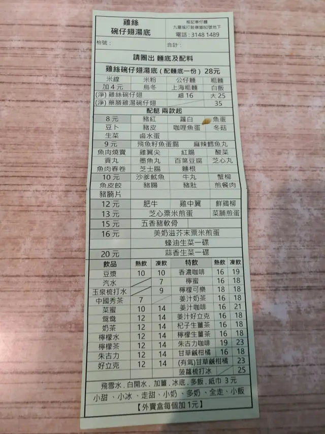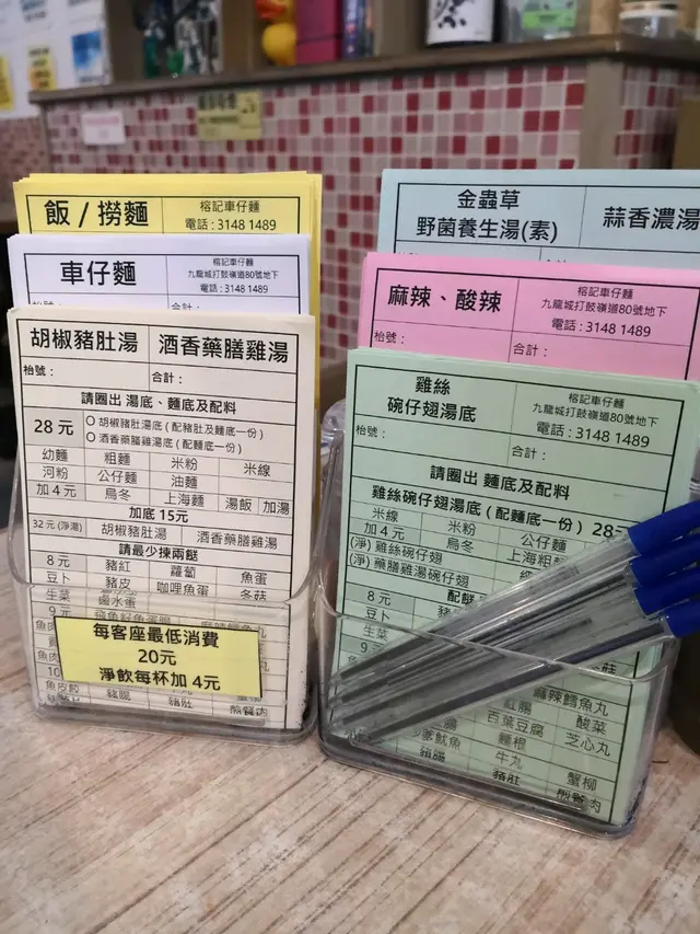 枱面有五色點餐紙🌈,代表唔同湯底既麵紙,淆底怕伏既香港人心理軀使下,揀咗風險程度為低既雞絲🐥碗仔翅湯底,加貢丸,肥牛🐂,魚皮餃🐟,仲有佢出名既芝心🧀粟米🌽煎蛋🥚,仲有跟咗我最愛既粗麵