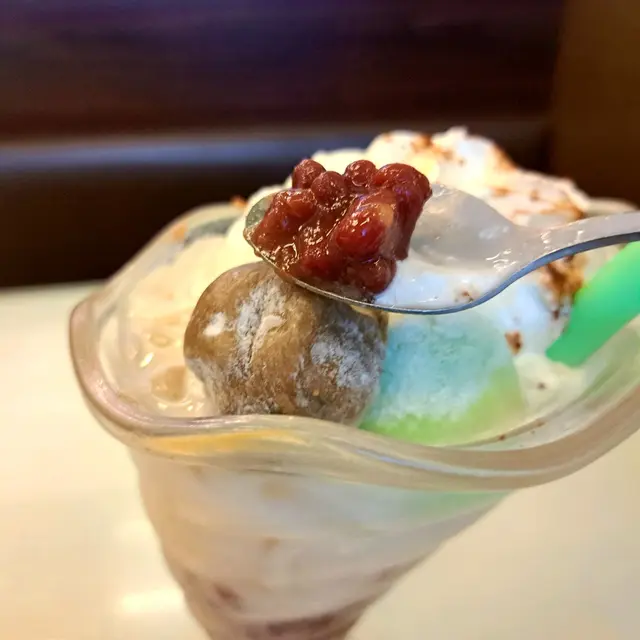 一丁麵可以加錢飲呢個紅豆冰,之前見到賣相好特別又得意,上面插住一張有餐廳名嘅威化餅啤牌,點知嚟到嘅時候只有一條圓柱形嘅餅,實在有啲失望!上面係忌廉,有三粒雪糕雪米糍,分別係士多啤梨、朱古力同綠茶味,紅豆都算粒粒分明,味道唔算突出,只係正常!