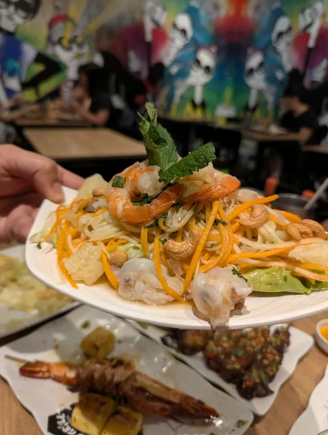 柚子salad 再小辣d, 好多青木瓜絲好爽脆, 仲有爽彈蝦 墨魚頭 酸甜柚子同腰果